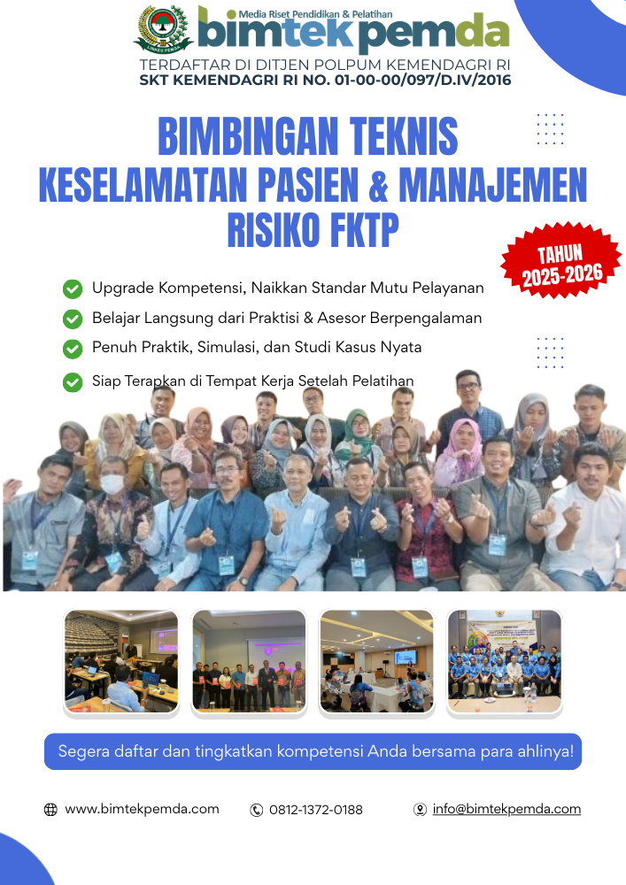 Bimbingan Teknis Keselamatan Pasien dan Manajemen Risiko FKTP hadir sebagai solusi sistematis untuk meningkatkan budaya keselamatan, mengurangi insiden, memperkuat kemampuan analisis risiko, dan memastikan pelayanan berjalan aman dan berkualitas.