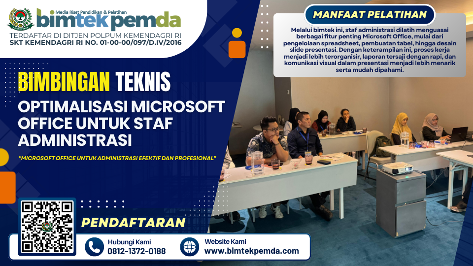Bimtek Optimalisasi Microsoft Office untuk Staf Administrasi dirancang untuk meningkatkan keterampilan peserta dalam memanfaatkan Word, Excel, dan PowerPoint secara efektif. Pelatihan ini membahas fitur lanjutan, tips, dan trik untuk mempercepat pekerjaan administrasi, mulai dari pengolahan dokumen, pengelolaan data, hingga pembuatan presentasi yang profesional. Melalui metode praktik langsung, peserta akan mampu mengurangi kesalahan kerja, meningkatkan produktivitas, dan menghasilkan output berkualitas. Program ini sangat cocok untuk staf administrasi, tenaga kependidikan, dan pegawai yang ingin menguasai Microsoft Office guna mendukung efisiensi dan efektivitas kerja di instansi pemerintah maupun swasta.