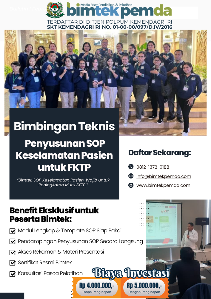 Karena itu, Bimbingan Teknis Panduan Penyusunan SOP Keselamatan Pasien untuk FKTP menjadi kebutuhan penting bagi fasilitas kesehatan yang ingin memperkuat kesiapan akreditasi, meningkatkan budaya keselamatan, serta meminimalkan risiko insiden yang dapat mengancam keselamatan pasien.