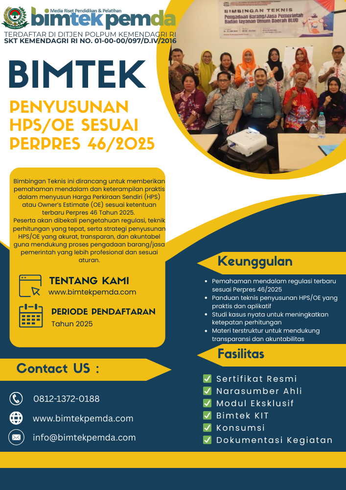 Daftarkan segera instansi Anda dalam program pelatihan resmi agar mampu menyusun HPS/OE yang akurat, transparan, dan sesuai Perpres 46/2025.