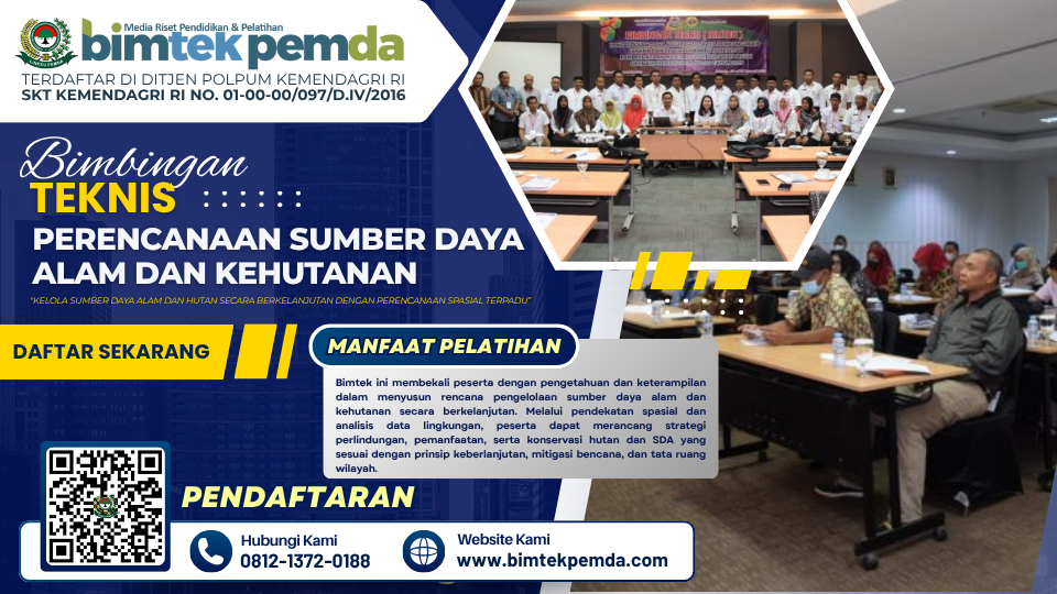 Pelatihan ini menjadi langkah konkret dalam meningkatkan efektivitas pengelolaan sumber daya alam dan kehutanan yang berbasis keberlanjutan. Dengan pendekatan ilmiah, partisipatif, dan berbasis data, peserta diharapkan mampu menyusun dokumen perencanaan yang visioner, realistis, serta berdampak langsung pada kelestarian lingkungan dan kesejahteraan masyarakat. Sehubungan dengan itu kami dari Pusat Diklat dan Bimtek Pemerintahan Lembaga Informasi Keuangan Pembangunan Daerah (BIMTEK PEMDA) selaku penyelenggara kegiatan serta dukungan narasumber yang berkompeten dibidangnya, Mengundang Bapak/Ibu untuk mengikuti kegiatan ”Bimbingan Teknis Perencanaan Sumber Daya Alam dan Kehutanan“ yang akan dilaksanakan.