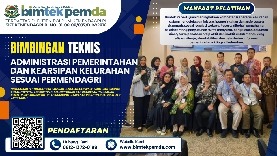Bimtek Administrasi Pemerintahan dan Kearsipan Kelurahan Sesuai Permendagri bertujuan meningkatkan kapasitas aparatur dalam mengelola tata administrasi dan arsip secara tertib, sistematis, dan sesuai regulasi. Materi mencakup tata naskah dinas, jadwal retensi arsip, pengelolaan arsip aktif dan inaktif, serta digitalisasi arsip. Peserta akan dilatih langsung oleh narasumber dari Kemendagri dan ANRI. Bimtek ini penting untuk meningkatkan akuntabilitas dan efisiensi pelayanan kelurahan, serta menghadirkan tata kelola administrasi publik yang profesional dan terstandar.