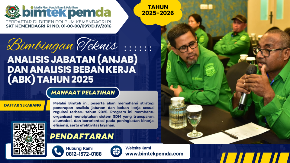 Bimtek Analisis Jabatan (ANJAB) dan Analisis Beban Kerja (ABK) bertujuan membekali peserta dengan pengetahuan dan keterampilan dalam menyusun dokumen ANJAB dan ABK sesuai regulasi terbaru. Melalui pelatihan ini, peserta akan mempelajari teknik penyusunan uraian jabatan, metode perhitungan beban kerja, serta penyusunan laporan yang akurat. Program ini sangat penting bagi pejabat struktural, staf SDM, bagian perencanaan, maupun pengawas kepegawaian di instansi pemerintah, BUMN, dan BUMD. Dengan implementasi ANJAB dan ABK yang baik, organisasi dapat meningkatkan efisiensi, efektivitas, serta tata kelola SDM yang transparan dan profesional.