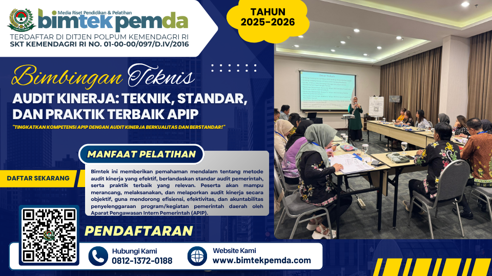 Audit kinerja merupakan salah satu bentuk pengawasan yang dilakukan oleh Aparat Pengawasan Intern Pemerintah (APIP) untuk menilai aspek ekonomi, efisiensi, dan efektivitas dari suatu program atau kegiatan pemerintah. Di tengah tuntutan peningkatan akuntabilitas publik dan reformasi birokrasi, audit kinerja tidak hanya menjadi alat pengawasan, tetapi juga sarana perbaikan berkelanjutan. Sayangnya, belum semua auditor internal memahami pendekatan, teknik, dan standar yang sesuai, sehingga perlu dilakukan peningkatan kapasitas melalui bimtek yang komprehensif dan aplikatif.