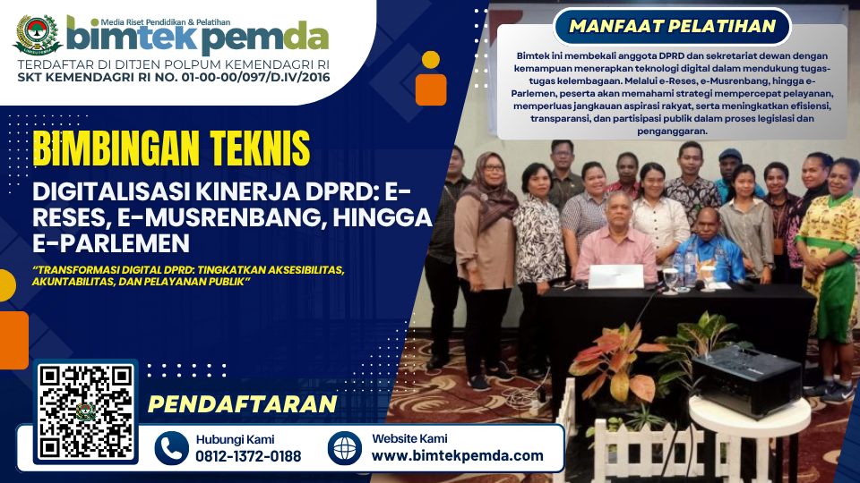Melalui bimtek ini, DPRD diharapkan mampu merancang dan menerapkan sistem kerja digital yang lebih efisien, transparan, dan modern. Digitalisasi kinerja lembaga legislatif seperti e-Reses, e-Musrenbang, dan e-Parlemen akan mendekatkan DPRD kepada rakyat serta memperkuat akuntabilitas dalam setiap kebijakan dan program yang dijalankan. Sehubungan dengan itu kami dari Pusat Diklat dan Bimtek Pemerintahan Lembaga Informasi Keuangan Pembangunan Daerah (BIMTEK PEMDA) selaku penyelenggara kegiatan serta dukungan narasumber yang berkompeten dibidangnya, Mengundang Bapak/Ibu untuk mengikuti kegiatan ”Bimtek Digitalisasi Kinerja DPRD: e-Reses, e-Musrenbang, hingga e-Parlemen“ yang akan dilaksanakan.