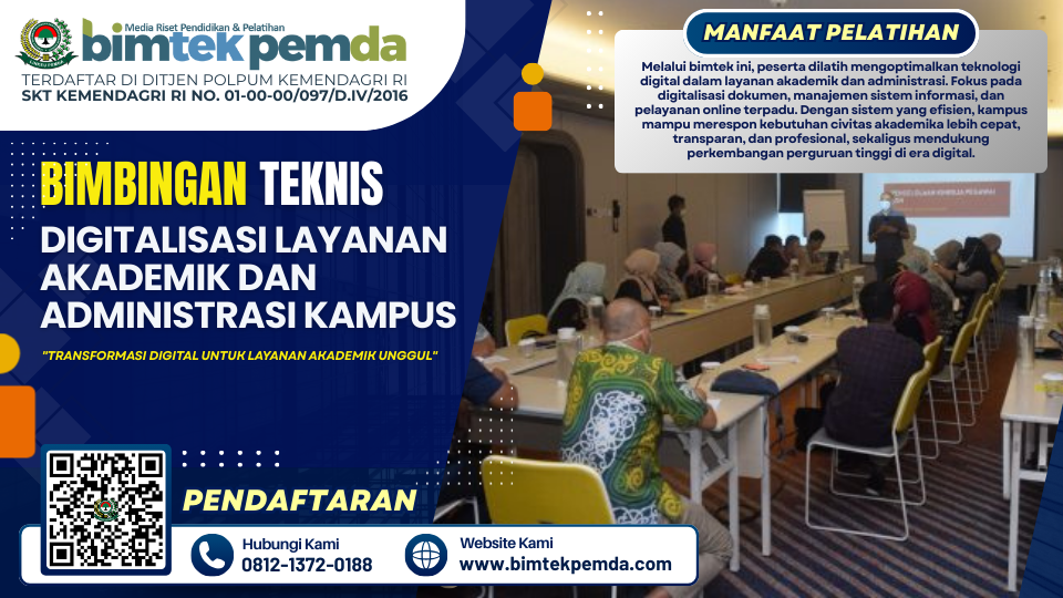 Bimtek ini diharapkan menjadi langkah strategis dalam mewujudkan layanan akademik dan administrasi kampus yang modern, efektif, dan terintegrasi. Sehubungan dengan itu kami dari Pusat Diklat dan Bimtek Pemerintahan Lembaga Informasi Keuangan Pembangunan Daerah (BIMTEK PEMDA) selaku penyelenggara kegiatan serta dukungan  narasumber yang berkompeten dibidangnya, Mengundang Bapak/Ibu untuk mengikuti kegiatan yang akan dilaksanakan.
