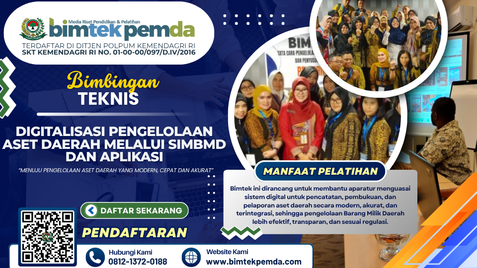 Bimtek ini mendukung pemerintah daerah dalam mempercepat transformasi digital, mempermudah tata kelola aset, serta meningkatkan transparansi dan akuntabilitas pengelolaan BMD. Sehubungan dengan itu kami dari Pusat Diklat dan Bimtek Pemerintahan Lembaga Informasi Keuangan Pembangunan Daerah (BIMTEK PEMDA) selaku penyelenggara kegiatan serta dukungan narasumber yang berkompeten dibidangnya, Mengundang Bapak/Ibu untuk mengikuti kegiatan ”Bimtek Digitalisasi Pengelolaan Aset Daerah melalui SIMBMD dan Aplikasi“ yang akan dilaksanakan.