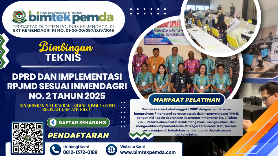 Dengan mengikuti bimtek ini, anggota DPRD diharapkan memiliki kemampuan untuk mengawal dan memastikan implementasi RPJMD berjalan sesuai arah kebijakan nasional dan kepentingan lokal. Sehubungan dengan itu kami dari Pusat Diklat dan Bimtek Pemerintahan Lembaga Informasi Keuangan Pembangunan Daerah (BIMTEK PEMDA) selaku penyelenggara kegiatan serta dukungan narasumber yang berkompeten dibidangnya, Mengundang Bapak/Ibu untuk mengikuti kegiatan ”Bimtek DPRD dan Implementasi RPJMD Sesuai Inmendagri No. 2 Tahun 2025“ yang akan dilaksanakan.