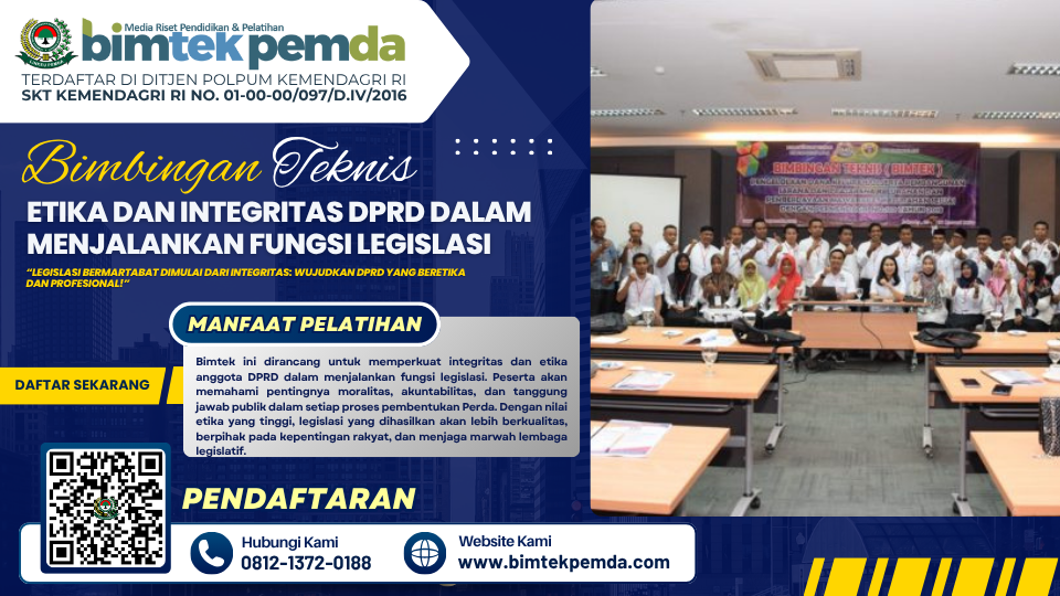 Bimtek ini diharapkan menjadi wahana refleksi dan penguatan nilai-nilai moral bagi anggota DPRD dalam melaksanakan fungsi legislasi. Legislasi yang etis dan berintegritas akan melahirkan peraturan daerah yang berkualitas, berpihak pada rakyat, serta menjaga marwah dan kepercayaan publik terhadap institusi DPRD. Sehubungan dengan itu kami dari Pusat Diklat dan Bimtek Pemerintahan Lembaga Informasi Keuangan Pembangunan Daerah (BIMTEK PEMDA) selaku penyelenggara kegiatan serta dukungan narasumber yang berkompeten dibidangnya, Mengundang Bapak/Ibu untuk mengikuti kegiatan ”Bimtek Etika dan Integritas DPRD dalam Menjalankan Fungsi Legislasi“ yang akan dilaksanakan.