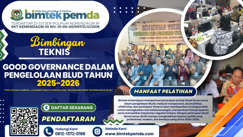 Bimtek Good Governance dalam Pengelolaan BLUD dirancang untuk meningkatkan pemahaman dan keterampilan aparatur dalam menerapkan tata kelola yang transparan, akuntabel, dan profesional. Pelatihan ini membahas konsep, regulasi, hingga praktik terbaik Good Governance untuk memperkuat manajemen BLUD. Peserta akan dibekali strategi penerapan transparansi, partisipasi, efektivitas, dan integritas dalam pelayanan publik. Dengan mengikuti bimtek ini, BLUD diharapkan mampu meningkatkan kualitas layanan, akuntabilitas pengelolaan keuangan, serta kepercayaan masyarakat. Program ini menjadi solusi tepat untuk mewujudkan BLUD yang modern, berdaya saing, dan sesuai prinsip tata kelola pemerintahan yang baik.