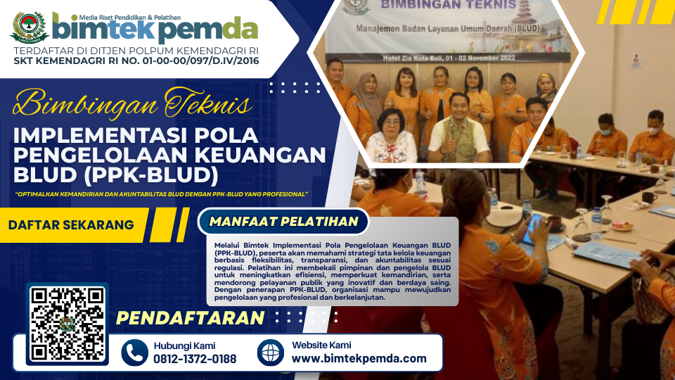 Bimtek Implementasi Pola Pengelolaan Keuangan BLUD merupakan langkah strategis untuk meningkatkan kapasitas aparatur dalam mengelola keuangan BLUD secara profesional, transparan, dan akuntabel. Sehubungan dengan itu kami dari Pusat Diklat dan Bimtek Pemerintahan Lembaga Informasi Keuangan Pembangunan Daerah (BIMTEK PEMDA) selaku penyelenggara kegiatan serta dukungan narasumber yang berkompeten dibidangnya, Mengundang Bapak/Ibu untuk mengikuti kegiatan “Bimtek Implementasi Pola Pengelolaan Keuangan BLUD (PPK-BLUD)” yang akan dilaksanakan.