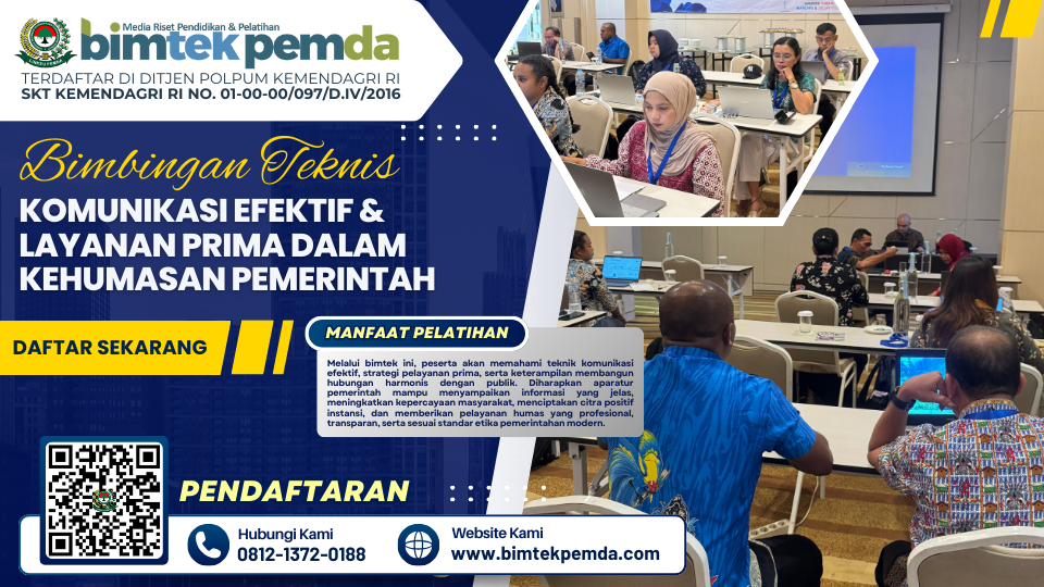 Bimtek Komunikasi Efektif & Layanan Prima dalam Kehumasan Pemerintah dirancang untuk meningkatkan kapasitas aparatur dalam menyampaikan informasi publik yang jelas, ramah, dan profesional. Peserta akan mempelajari strategi komunikasi efektif, public speaking, serta layanan prima yang mendukung terciptanya hubungan baik antara pemerintah dan masyarakat. Melalui pelatihan ini, aparatur humas diharapkan mampu memberikan pelayanan komunikasi yang transparan, responsif, dan membangun citra positif instansi. Bimtek ini sangat relevan untuk ASN, aparatur humas, dan petugas layanan informasi publik agar lebih siap menghadapi tantangan komunikasi di era digital.