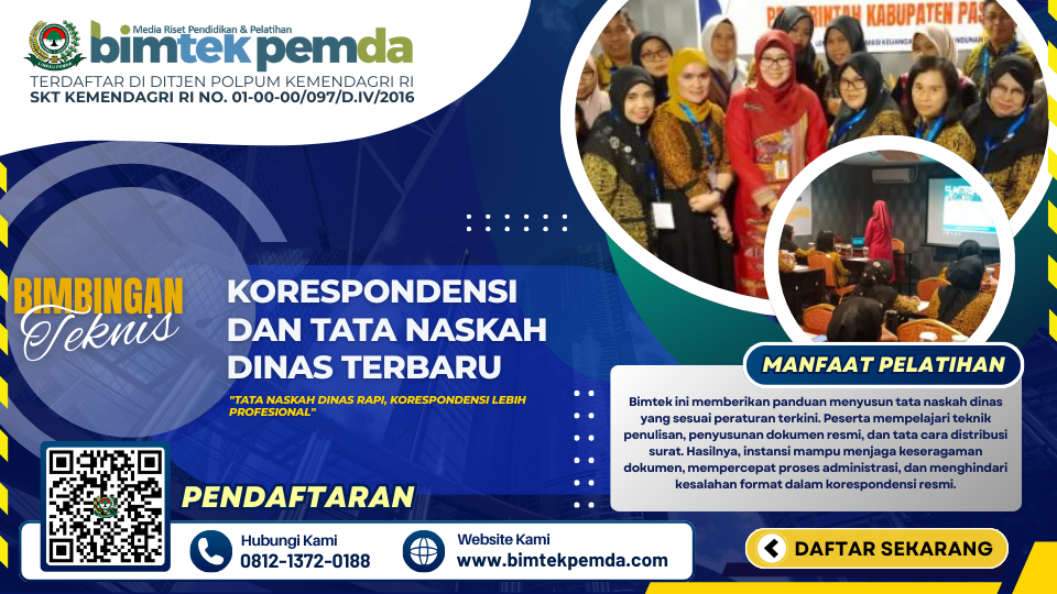 Bimtek Korespondensi dan Tata Naskah Dinas Terbaru dirancang untuk membekali peserta dengan keterampilan membuat surat dinas, nota, dan dokumen resmi sesuai ketentuan terbaru. Pelatihan ini mencakup pemahaman format surat, bahasa resmi, penomoran surat, pengarsipan, serta pemanfaatan teknologi dalam administrasi surat-menyurat. Melalui studi kasus dan praktik langsung, peserta akan mampu menyusun dokumen yang cepat, tepat, dan sesuai standar. Program ini sangat relevan bagi pegawai administrasi, sekretaris, dan staf tata usaha yang ingin meningkatkan profesionalisme serta keseragaman dokumen di lingkungan kerja, baik di instansi pemerintah maupun swasta.