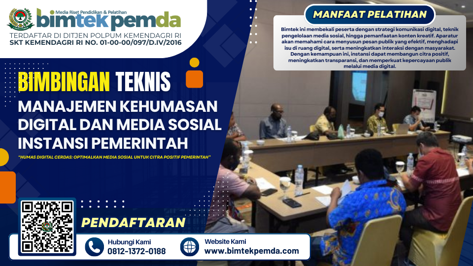 Bimtek Manajemen Kehumasan Digital dan Media Sosial Instansi Pemerintah dirancang untuk meningkatkan kapasitas aparatur dalam mengelola komunikasi publik berbasis teknologi. Pelatihan ini membekali peserta dengan strategi komunikasi digital, pengelolaan konten kreatif, manajemen krisis media sosial, serta branding instansi di era digital. Melalui metode interaktif, studi kasus, dan praktik langsung, peserta akan memahami cara memanfaatkan media sosial secara optimal untuk membangun citra positif instansi. Program ini sangat penting bagi humas, protokoler, dan ASN yang terlibat dalam pengelolaan informasi publik pemerintah.