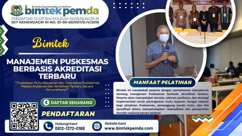 Bimbingan teknis ini diharapkan dapat meningkatkan kesiapan Puskesmas dalam menghadapi akreditasi serta memperkuat sistem pelayanan yang berkelanjutan dan berkualitas. Sehubungan dengan itu kami dari Pusat Diklat dan Bimtek Pemerintahan Lembaga Informasi Keuangan Pembangunan Daerah (BIMTEK PEMDA) selaku penyelenggara kegiatan serta dukungan  narasumber yang berkompeten dibidangnya, Mengundang Bapak/Ibu untuk mengikuti kegiatan Bimtek Manajemen Puskesmas Berbasis Akreditasi Terbaru yang akan dilaksanakan.