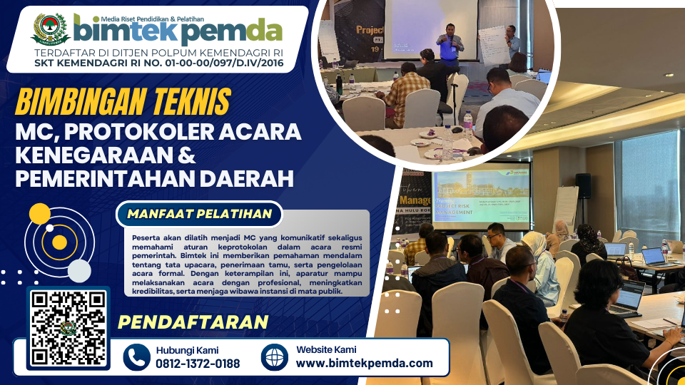Bimtek MC, Protokoler Acara Kenegaraan & Pemerintahan Daerah merupakan langkah strategis dalam meningkatkan keterampilan aparatur pemerintah di bidang komunikasi publik dan tata acara resmi. Sehubungan dengan itu kami dari Pusat Diklat dan Bimtek Pemerintahan Lembaga Informasi Keuangan Pembangunan Daerah (BIMTEK PEMDA) selaku penyelenggara kegiatan serta dukungan narasumber yang berkompeten dibidangnya, Mengundang Bapak/Ibu untuk mengikuti kegiatan yang akan dilaksanakan.