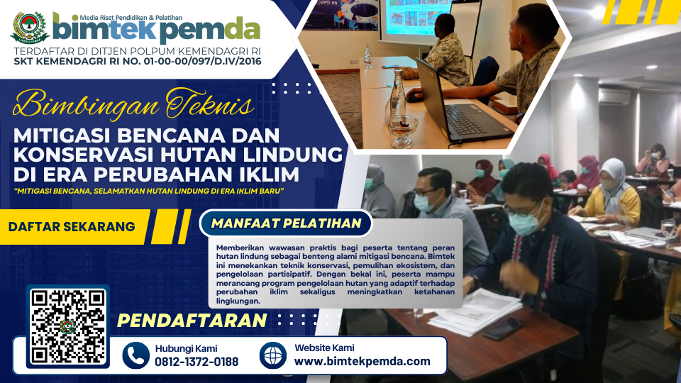 Bimtek ini diharapkan mampu memperkuat kapasitas peserta dalam merancang dan melaksanakan strategi mitigasi bencana serta konservasi hutan lindung di era perubahan iklim. Sehubungan dengan itu kami dari Pusat Diklat dan Bimtek Pemerintahan Lembaga Informasi Keuangan Pembangunan Daerah (BIMTEK PEMDA) selaku penyelenggara kegiatan serta dukungan  narasumber yang berkompeten dibidangnya, Mengundang Bapak/Ibu untuk mengikuti kegiatan yang akan dilaksanakan.