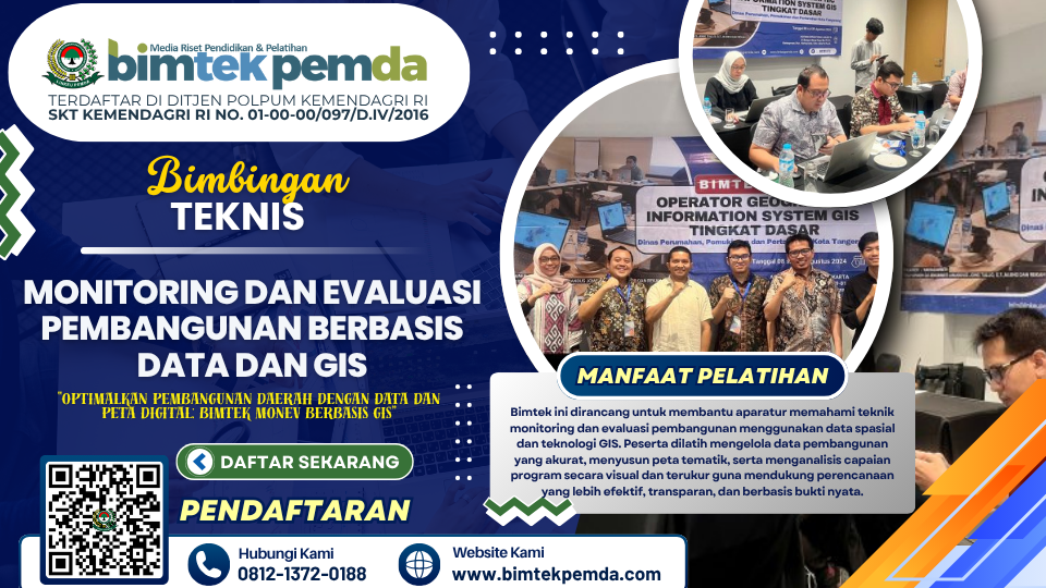 Bimtek ini diharapkan mampu meningkatkan kapasitas teknis dan analitis para aparatur pemerintah dalam melakukan monitoring dan evaluasi pembangunan secara akurat dan berbasis bukti. Melalui pemanfaatan teknologi GIS dan pengolahan data spasial, proses evaluasi menjadi lebih objektif, transparan, dan visual, sehingga memperkuat pengambilan keputusan dan perencanaan pembangunan berkelanjutan. Sehubungan dengan itu kami dari Pusat Diklat dan Bimtek Pemerintahan Lembaga Informasi Keuangan Pembangunan Daerah (BIMTEK PEMDA) selaku penyelenggara kegiatan serta dukungan  narasumber yang berkompeten dibidangnya, Mengundang Bapak/Ibu untuk mengikuti kegiatan Bimtek Monitoring dan Evaluasi Pembangunan Berbasis Data dan GIS yang akan dilaksanakan.