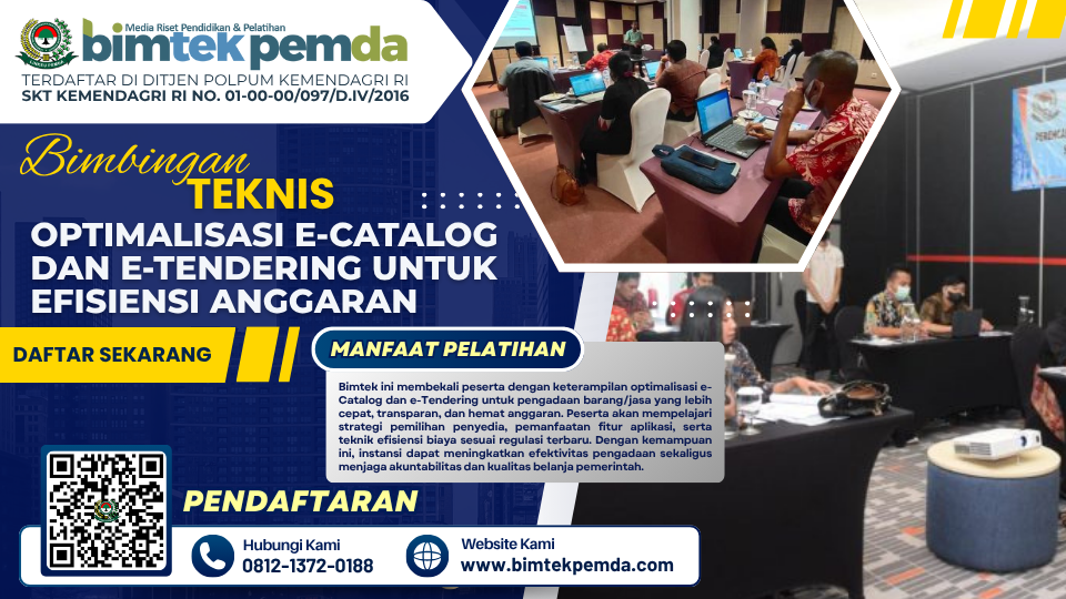 Melalui pelatihan ini, peserta diharapkan mampu memaksimalkan penggunaan e-Catalog dan e-Tendering untuk mewujudkan pengadaan yang efisien, transparan, dan tepat sasaran, sehingga berdampak positif pada pengelolaan anggaran instansi. Sehubungan dengan itu kami dari Pusat Diklat dan Bimtek Pemerintahan Lembaga Informasi Keuangan Pembangunan Daerah (BIMTEK PEMDA) selaku penyelenggara kegiatan serta dukungan narasumber yang berkompeten dibidangnya, Mengundang Bapak/Ibu untuk mengikuti kegiatan yang akan dilaksanakan.