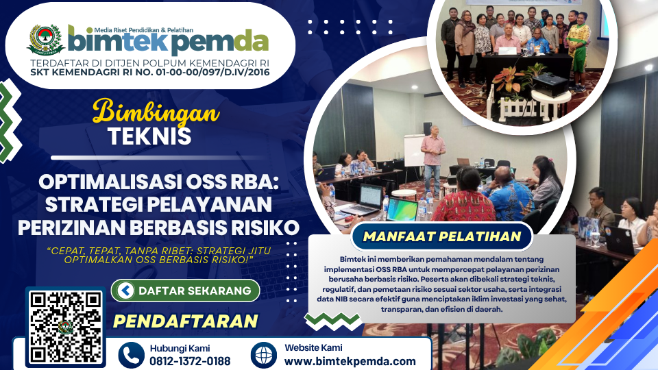Optimalisasi penggunaan OSS RBA merupakan langkah strategis dalam mendorong percepatan layanan perizinan dan peningkatan investasi daerah. Dengan bimbingan teknis ini, instansi pelayanan publik dapat memberikan layanan yang profesional, adaptif, dan selaras dengan transformasi digital pemerintahan. Sehubungan dengan itu kami dari Pusat Diklat dan Bimtek Pemerintahan Lembaga Informasi Keuangan Pembangunan Daerah (BIMTEK PEMDA) selaku penyelenggara kegiatan serta dukungan narasumber yang berkompeten dibidangnya, Mengundang Bapak/Ibu untuk mengikuti kegiatan ”BIMTEK OPTIMALISASI OSS RBA: STRATEGI PELAYANAN PERIZINAN BERBASIS RISIKO“ yang akan dilaksanakan.