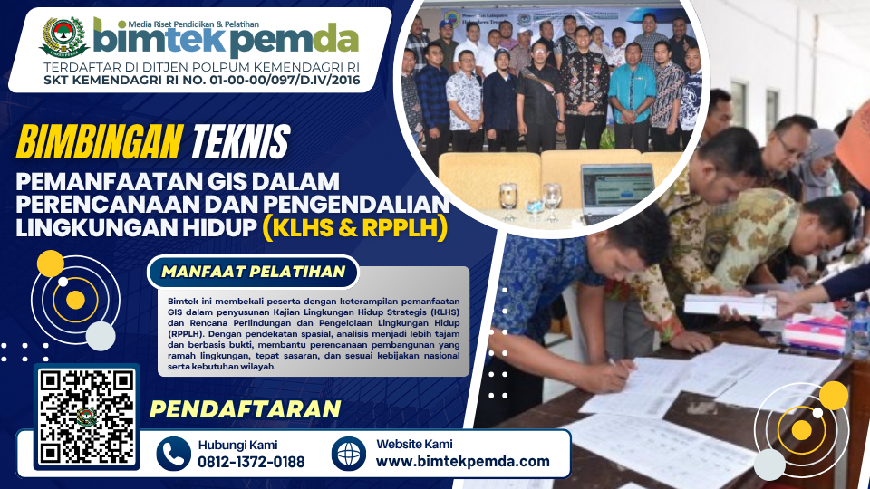 Bimtek ini memberikan pemahaman menyeluruh serta keterampilan praktis dalam penggunaan GIS untuk mendukung perencanaan dan pengendalian lingkungan hidup. Peserta diharapkan mampu mengintegrasikan teknologi spasial ke dalam proses penyusunan KLHS dan RPPLH, serta menciptakan peta tematik yang menjadi dasar pengambilan keputusan pembangunan berwawasan lingkungan. Sehubungan dengan itu kami dari Pusat Diklat dan Bimtek Pemerintahan Lembaga Informasi Keuangan Pembangunan Daerah (BIMTEK PEMDA) selaku penyelenggara kegiatan serta dukungan narasumber yang berkompeten dibidangnya, Mengundang Bapak/Ibu untuk mengikuti kegiatan ”Bimtek Pemanfaatan GIS dalam Perencanaan dan Pengendalian Lingkungan Hidup (KLHS & RPPLH)“ yang akan dilaksanakan.