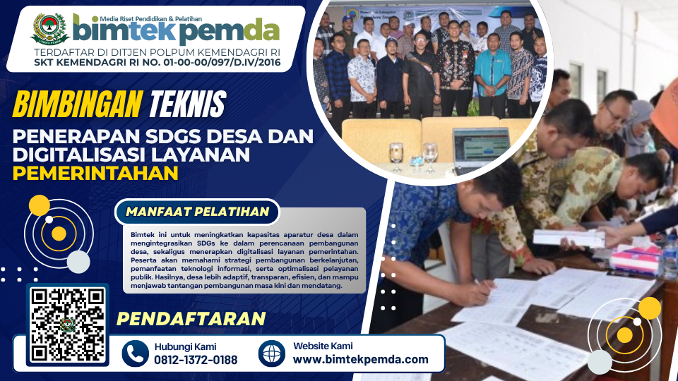 Bimbingan Teknis Penerapan SDGs Desa dan Digitalisasi Layanan Pemerintahan ini menjadi langkah strategis untuk mewujudkan tata kelola pemerintahan desa yang modern, transparan, dan partisipatif. Sehubungan dengan itu kami dari Pusat Diklat dan Bimtek Pemerintahan Lembaga Informasi Keuangan Pembangunan Daerah (BIMTEK PEMDA) selaku penyelenggara kegiatan serta dukungan narasumber yang berkompeten dibidangnya, Mengundang Bapak/Ibu untuk mengikuti kegiatan ”Bimtek Penerapan SDGs Desa dan Digitalisasi Layanan Pemerintahan“ yang akan dilaksanakan.