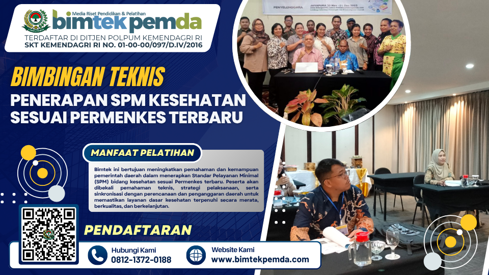 Bimtek ini menjadi wadah strategis dalam meningkatkan pemahaman dan keterampilan teknis dalam penerapan SPM kesehatan sesuai Permenkes terbaru. Sehubungan dengan itu kami dari Pusat Diklat dan Bimtek Pemerintahan Lembaga Informasi Keuangan Pembangunan Daerah (BIMTEK PEMDA) selaku penyelenggara kegiatan serta dukungan  narasumber yang berkompeten dibidangnya, Mengundang Bapak/Ibu untuk mengikuti kegiatan Bimtek Penerapan SPM Kesehatan Sesuai Permenkes Terbaru yang akan dilaksanakan.