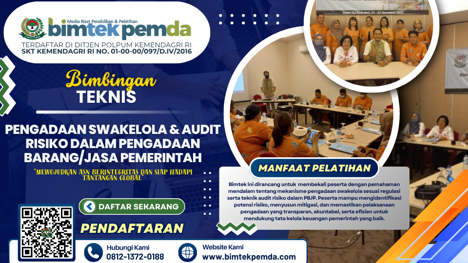 Bimtek ini diharapkan dapat meningkatkan kapasitas aparatur pemerintah dalam melaksanakan pengadaan swakelola yang efektif sekaligus memperkuat mekanisme audit risiko guna mendukung tata kelola pengadaan yang bersih, transparan, dan akuntabel. Sehubungan dengan itu kami dari Pusat Diklat dan Bimtek Pemerintahan Lembaga Informasi Keuangan Pembangunan Daerah (BIMTEK PEMDA) selaku penyelenggara kegiatan serta dukungan narasumber yang berkompeten dibidangnya, Mengundang Bapak/Ibu untuk mengikuti kegiatan ”Bimtek Pengadaan Swakelola & Audit Risiko dalam Pengadaan Barang/Jasa Pemerintah” yang akan dilaksanakan.