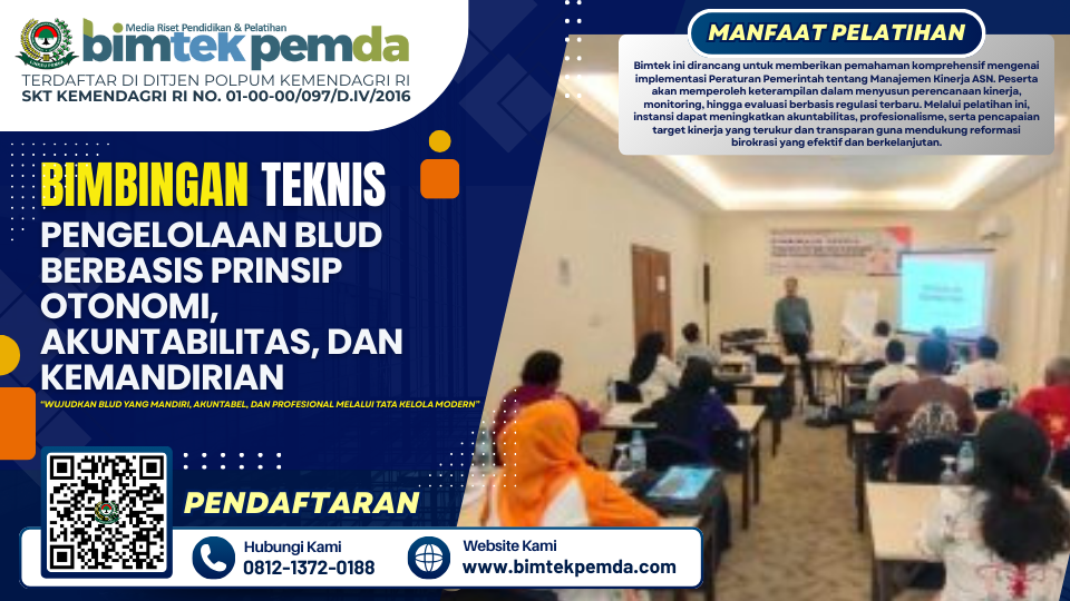 Bimtek Pengelolaan BLUD berbasis Prinsip Otonomi, Akuntabilitas, dan Kemandirian bertujuan memperkuat kapasitas aparatur dalam mengelola BLUD secara transparan, profesional, dan mandiri. Peserta akan mempelajari strategi penerapan prinsip otonomi untuk meningkatkan efisiensi, akuntabilitas dalam pertanggungjawaban publik, serta kemandirian dalam pengelolaan keuangan. Pelatihan ini dirancang agar BLUD mampu memberikan layanan publik yang lebih optimal, berdaya saing, dan berorientasi pada kinerja. Dengan pemahaman yang komprehensif, diharapkan BLUD dapat mengurangi ketergantungan pada APBD dan mendorong peningkatan kualitas layanan.