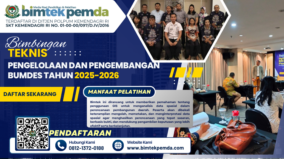 Bimbingan Teknis Pengelolaan & Pengembangan BUMDes ini diharapkan menjadi solusi nyata dalam meningkatkan kapasitas aparatur desa dan pengurus BUMDes untuk mengelola usaha desa secara profesional, transparan, serta sesuai regulasi yang berlaku. Sehubungan dengan itu kami dari Pusat Diklat dan Bimtek Pemerintahan Lembaga Informasi Keuangan Pembangunan Daerah (BIMTEK PEMDA) selaku penyelenggara kegiatan serta dukungan  narasumber yang berkompeten dibidangnya, Mengundang Bapak/Ibu untuk mengikuti kegiatan Bimtek Pengelolaan dan Pengembangan BUMDes Tahun 2025-2026 yang akan dilaksanakan.