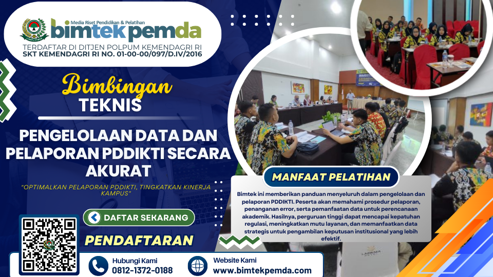 Bimtek Pengelolaan Data dan Pelaporan PDDikti Secara Akurat dirancang untuk meningkatkan keterampilan operator dan pengelola akademik perguruan tinggi dalam menginput, memverifikasi, dan melaporkan data sesuai regulasi terbaru Kemdikbudristek. Peserta akan mempelajari kebijakan PDDikti, teknik validasi data, integrasi dengan sistem akademik internal, serta strategi pelaporan yang tepat waktu. Pelatihan ini memadukan materi regulasi, praktik langsung, dan studi kasus sehingga perguruan tinggi dapat meminimalkan kesalahan, memperlancar proses akreditasi, dan meningkatkan mutu layanan akademik. Program ini sangat penting bagi keberhasilan manajemen data pendidikan tinggi yang kredibel dan berkelanjutan.