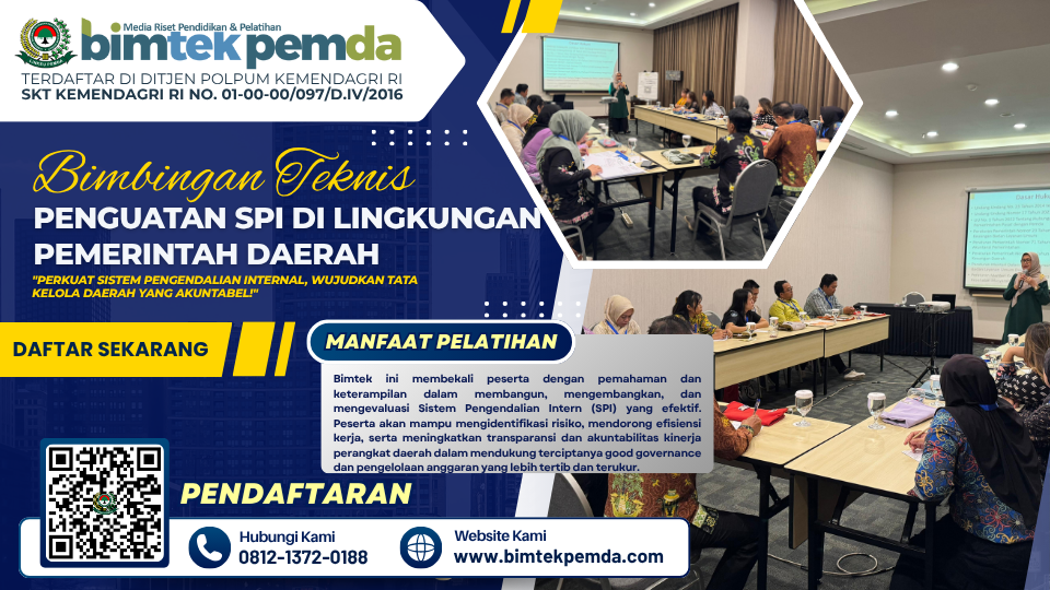 Melalui kegiatan ini, peserta diharapkan mampu mengidentifikasi, menerapkan, dan mengawasi sistem pengendalian intern secara menyeluruh dan berkelanjutan. SPI yang kuat akan menjadi fondasi penting dalam membangun pemerintahan daerah yang bersih, responsif, dan akuntabel. Sehubungan dengan itu kami dari Pusat Diklat dan Bimtek Pemerintahan Lembaga Informasi Keuangan Pembangunan Daerah (BIMTEK PEMDA) selaku penyelenggara kegiatan serta dukungan narasumber yang berkompeten dibidangnya, Mengundang Bapak/Ibu untuk mengikuti kegiatan ”Bimtek Penguatan SPI di Lingkungan Pemerintah Daerah“ yang akan dilaksanakan.