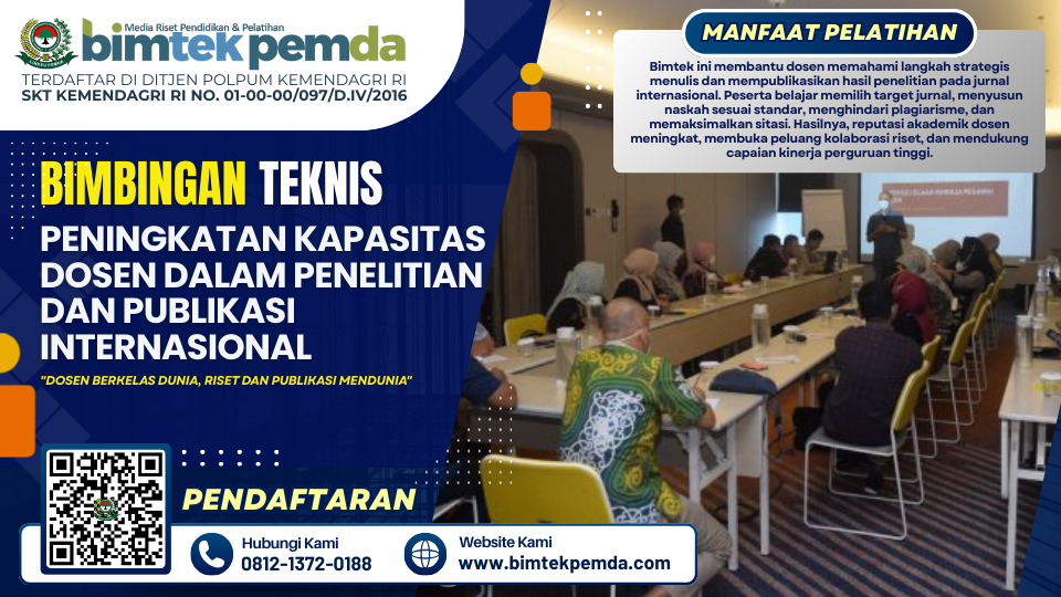 Bimtek ini diharapkan menjadi langkah strategis dalam meningkatkan kualitas penelitian dan publikasi dosen di tingkat internasional. Sehubungan dengan itu kami dari Pusat Diklat dan Bimtek Pemerintahan Lembaga Informasi Keuangan Pembangunan Daerah (BIMTEK PEMDA) selaku penyelenggara kegiatan serta dukungan  narasumber yang berkompeten dibidangnya, Mengundang Bapak/Ibu untuk mengikuti kegiatan yang akan dilaksanakan.