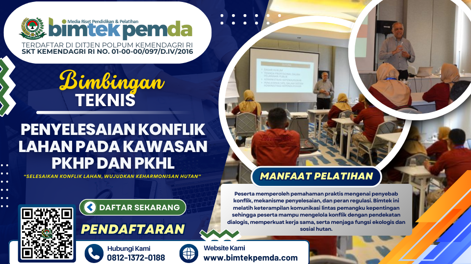 Dengan mengikuti Bimtek ini, peserta akan memperoleh keterampilan praktis dalam menangani konflik lahan di kawasan PKHP dan PKHL. Sehubungan dengan itu kami dari Pusat Diklat dan Bimtek Pemerintahan Lembaga Informasi Keuangan Pembangunan Daerah (BIMTEK PEMDA) selaku penyelenggara kegiatan serta dukungan  narasumber yang berkompeten dibidangnya, Mengundang Bapak/Ibu untuk mengikuti kegiatan yang akan dilaksanakan.