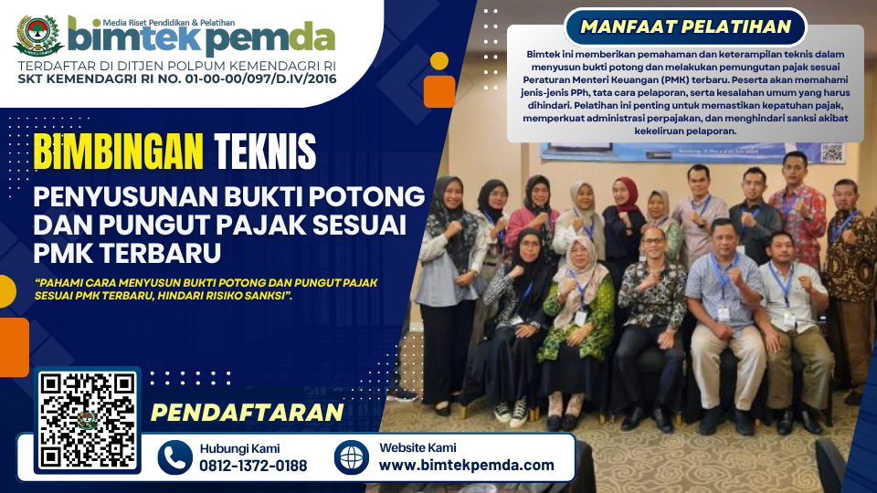 Melalui pelatihan ini, peserta diharapkan mampu menjalankan kewajiban pemotongan dan pemungutan pajak secara tepat dan sesuai regulasi terbaru. Sehubungan dengan itu kami dari Pusat Diklat dan Bimtek Pemerintahan Lembaga Informasi Keuangan Pembangunan Daerah (BIMTEK PEMDA) selaku penyelenggara kegiatan serta dukungan narasumber yang berkompeten dibidangnya, Mengundang Bapak/Ibu untuk mengikuti kegiatan ”Bimtek Penyusunan Bukti Potong dan Pungut Pajak Sesuai PMK Terbaru“ yang akan dilaksanakan.