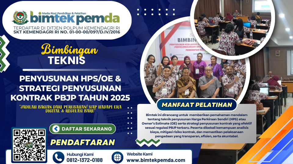 Bimbingan Teknis ini menjadi solusi untuk meningkatkan kompetensi aparatur dalam menyusun HPS/OE dan kontrak PBJP yang efektif, transparan, serta akuntabel sesuai peraturan terkini. Sehubungan dengan itu kami dari Pusat Diklat dan Bimtek Pemerintahan Lembaga Informasi Keuangan Pembangunan Daerah (BIMTEK PEMDA) selaku penyelenggara kegiatan serta dukungan narasumber yang berkompeten dibidangnya, Mengundang Bapak/Ibu untuk mengikuti kegiatan ”Bimtek Penyusunan HPS/OE & Strategi Penyusunan Kontrak PBJP Tahun 2025“ yang akan dilaksanakan.