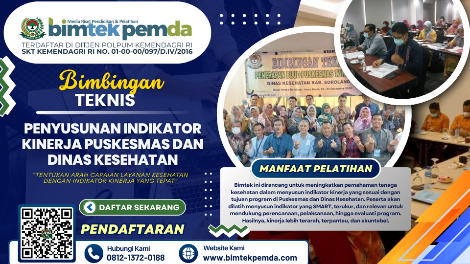 Bimbingan teknis ini diharapkan dapat membantu peserta menyusun indikator kinerja yang tepat dan aplikatif guna mendukung tata kelola kesehatan yang transparan, terukur, dan berbasis hasil. Sehubungan dengan itu kami dari Pusat Diklat dan Bimtek Pemerintahan Lembaga Informasi Keuangan Pembangunan Daerah (BIMTEK PEMDA) selaku penyelenggara kegiatan serta dukungan narasumber yang berkompeten dibidangnya, Mengundang Bapak/Ibu untuk mengikuti kegiatan ”Bimtek Penyusunan Indikator Kinerja Puskesmas dan Dinas Kesehatan” yang akan dilaksanakan.