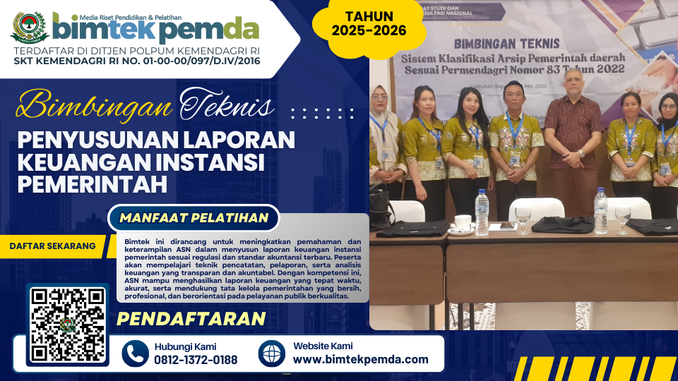 Bimtek Penyusunan Laporan Keuangan Instansi Pemerintah merupakan langkah strategis untuk memperkuat akuntabilitas dan transparansi pengelolaan keuangan negara. Sehubungan dengan itu kami dari Pusat Diklat dan Bimtek Pemerintahan Lembaga Informasi Keuangan Pembangunan Daerah (BIMTEK PEMDA) selaku penyelenggara kegiatan serta dukungan  narasumber yang berkompeten dibidangnya, Mengundang Bapak/Ibu untuk mengikuti kegiatan yang akan dilaksanakan.