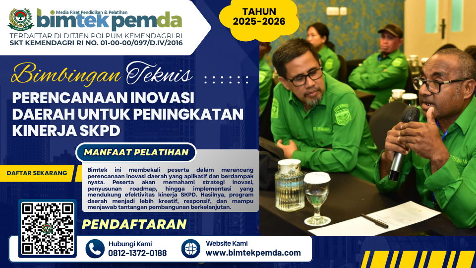 Bimtek Perencanaan Inovasi Daerah untuk Peningkatan Kinerja SKPD diharapkan dapat memperkuat kapasitas aparatur dalam merancang dan mengintegrasikan inovasi ke dalam perencanaan pembangunan. Sehubungan dengan itu kami dari Pusat Diklat dan Bimtek Pemerintahan Lembaga Informasi Keuangan Pembangunan Daerah (BIMTEK PEMDA) selaku penyelenggara kegiatan serta dukungan narasumber yang berkompeten dibidangnya, Mengundang Bapak/Ibu untuk mengikuti kegiatan yang akan dilaksanakan.