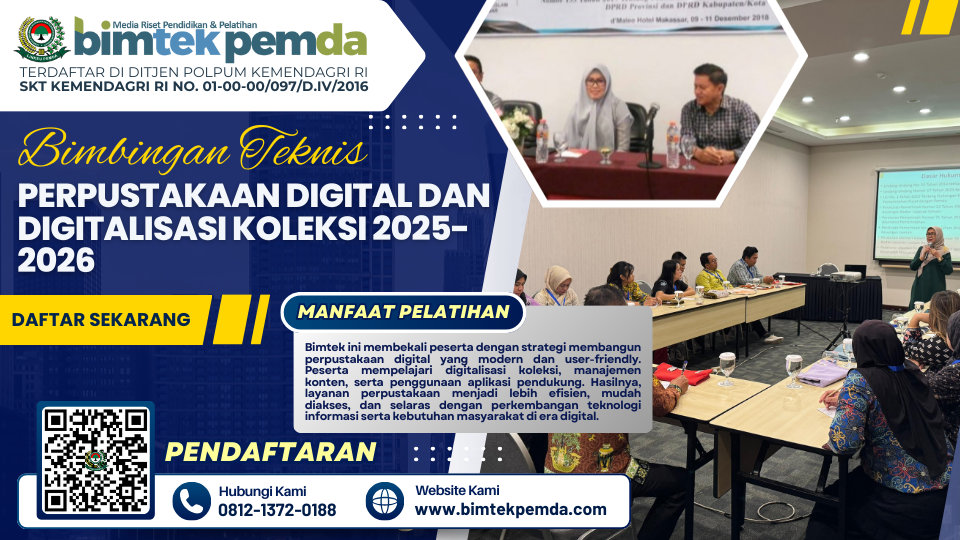 Bimtek ini diharapkan dapat meningkatkan kompetensi peserta dalam mengelola perpustakaan digital secara efektif. Sehubungan dengan itu kami dari Pusat Diklat dan Bimtek Pemerintahan Lembaga Informasi Keuangan Pembangunan Daerah (BIMTEK PEMDA) selaku penyelenggara kegiatan serta dukungan narasumber yang berkompeten dibidangnya, Mengundang Bapak/Ibu untuk mengikuti kegiatan yang akan dilaksanakan.