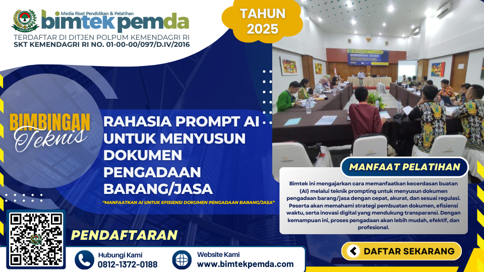 Bimtek Rahasia Prompt AI untuk Menyusun Dokumen Pengadaan Barang/Jasa menjadi langkah strategis dalam memperkenalkan inovasi teknologi digital ke dalam tata kelola pengadaan pemerintah. Sehubungan dengan itu kami dari Pusat Diklat dan Bimtek Pemerintahan Lembaga Informasi Keuangan Pembangunan Daerah (BIMTEK PEMDA) selaku penyelenggara kegiatan serta dukungan narasumber yang berkompeten dibidangnya, Mengundang Bapak/Ibu untuk mengikuti kegiatan yang akan dilaksanakan.