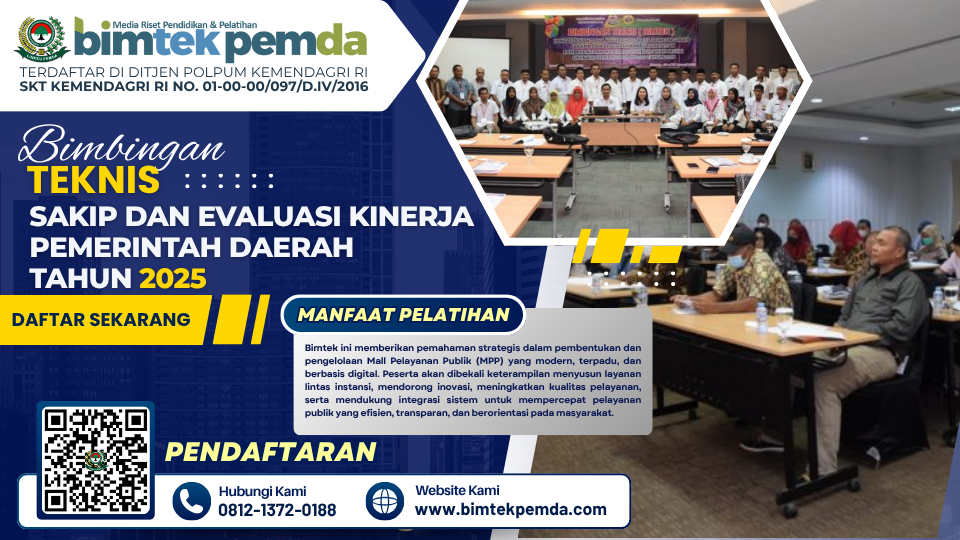 Melalui kegiatan Bimtek SAKIP dan Evaluasi Kinerja Pemerintah Daerah ini, diharapkan peserta mampu memahami prinsip-prinsip akuntabilitas kinerja secara menyeluruh dan mengimplementasikannya dalam penyusunan dokumen perencanaan serta pelaporan kinerja instansi secara tepat, terukur, dan sesuai regulasi. Sehubungan dengan itu kami dari Pusat Diklat dan Bimtek Pemerintahan Lembaga Informasi Keuangan Pembangunan Daerah (BIMTEK PEMDA) selaku penyelenggara kegiatan serta dukungan narasumber yang berkompeten dibidangnya, Mengundang Bapak/Ibu untuk mengikuti kegiatan ”Bimtek SAKIP dan Evaluasi Kinerja Pemerintah Daerah Tahun 2025“ yang akan dilaksanakan.