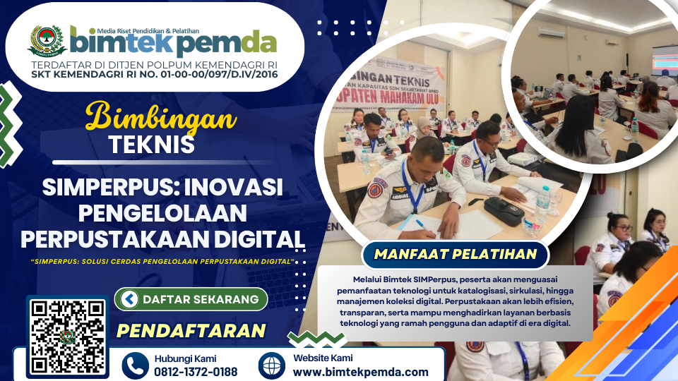 Bimtek ini diharapkan mampu mencetak pustakawan profesional yang siap mengelola perpustakaan digital melalui SIMPerpus. Sehubungan dengan itu kami dari Pusat Diklat dan Bimtek Pemerintahan Lembaga Informasi Keuangan Pembangunan Daerah (BIMTEK PEMDA) selaku penyelenggara kegiatan serta dukungan narasumber yang berkompeten dibidangnya, Mengundang Bapak/Ibu untuk mengikuti kegiatan yang akan dilaksanakan.