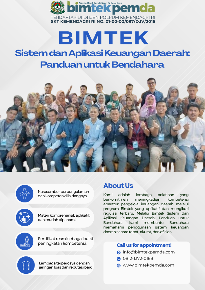 Bimtek Sistem dan Aplikasi Keuangan Daerah dirancang untuk memberikan pemahaman menyeluruh mengenai tata kelola keuangan daerah berbasis teknologi, mencakup aplikasi seperti SIPD-RI, SIMDA Keuangan, SIKD, dan sistem pendukung lainnya. Penguatan kompetensi ini sangat penting, sejalan dengan upaya peningkatan akuntabilitas keuangan daerah. Untuk perspektif yang lebih luas mengenai kemampuan bendahara, Anda dapat mempelajarinya pada Bimtek Penguatan Kompetensi Bendahara untuk Pengelolaan Keuangan Transparan.