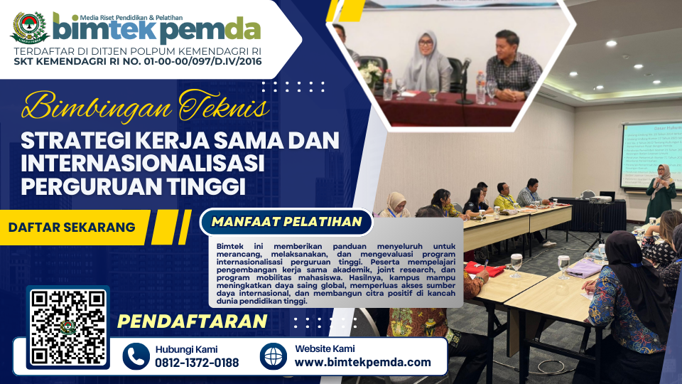 Bimtek Strategi Kerja Sama dan Internasionalisasi Perguruan Tinggi diharapkan menjadi langkah strategis dalam meningkatkan kualitas dan daya saing perguruan tinggi di kancah global. Sehubungan dengan itu kami dari Pusat Diklat dan Bimtek Pemerintahan Lembaga Informasi Keuangan Pembangunan Daerah (BIMTEK PEMDA) selaku penyelenggara kegiatan serta dukungan narasumber yang berkompeten dibidangnya, Mengundang Bapak/Ibu untuk mengikuti kegiatan yang akan dilaksanakan.