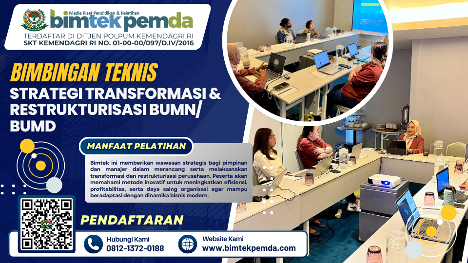 Melalui Bimtek ini, peserta diharapkan mampu memahami strategi transformasi dan restrukturisasi secara komprehensif, merancang langkah implementasi yang efektif, serta meningkatkan daya saing BUMN/BUMD dalam menghadapi dinamika bisnis dan regulasi. Sehubungan dengan itu kami dari Pusat Diklat dan Bimtek Pemerintahan Lembaga Informasi Keuangan Pembangunan Daerah (BIMTEK PEMDA) selaku penyelenggara kegiatan serta dukungan narasumber yang berkompeten dibidangnya, Mengundang Bapak/Ibu untuk mengikuti kegiatan yang akan dilaksanakan.