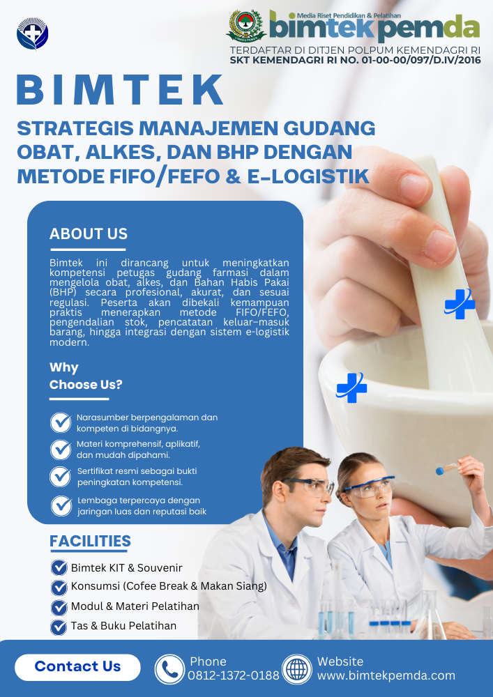 Dalam konteks perubahan regulasi, digitalisasi logistik, serta peningkatan akuntabilitas publik, pemerintah daerah, fasilitas pelayanan kesehatan, dan unit farmasi memerlukan penguatan kapasitas melalui Bimtek Strategis Manajemen Gudang Obat, Alkes, dan BHP dengan Metode FIFO/FEFO & E-Logistik.