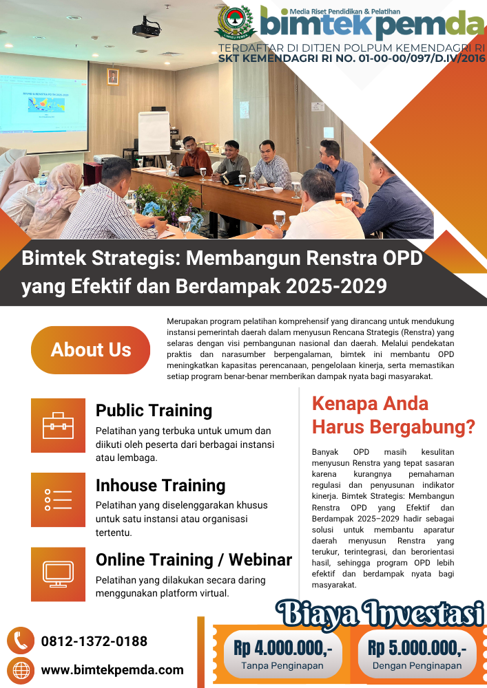 Dalam kerangka peningkatan kualitas perencanaan pemerintahan daerah, Bimtek Strategis: Membangun Renstra OPD yang Efektif dan Berdampak 2025-2029 hadir sebagai instrumen penguatan kapasitas Organisasi Perangkat Daerah (OPD). Artikel ini dirancang sebagai pilar konten yang menyeluruh dan mendetail, untuk menjadi acuan publik & landasan bagi artikel turunan terkait penyusunan Renstra OPD, evaluasi, integrasi perencanaan, dan optimalisasi kinerja OPD.