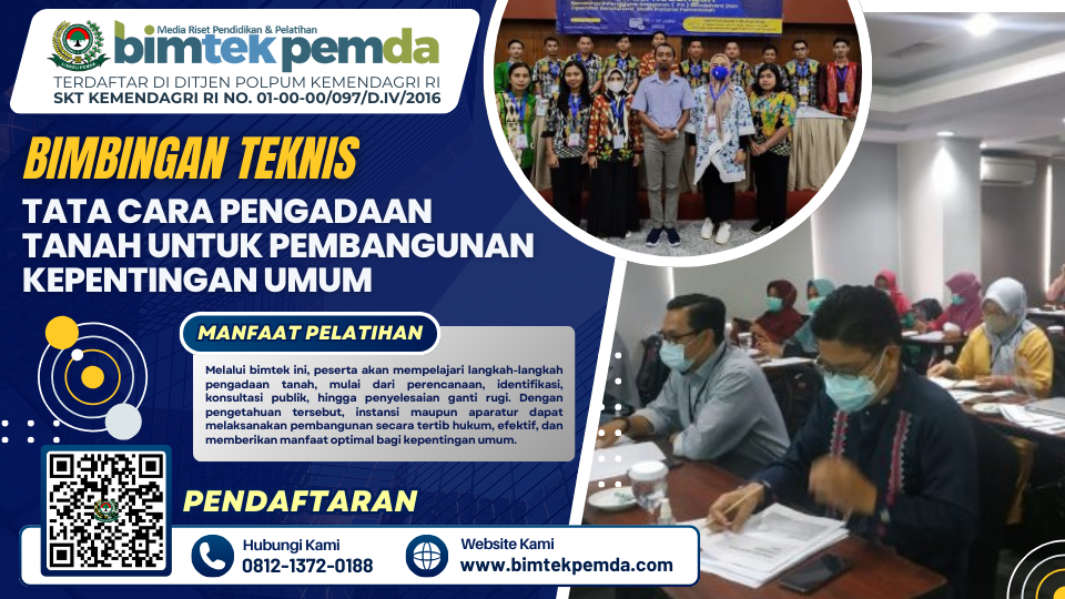 Pengadaan tanah untuk pembangunan kepentingan umum merupakan salah satu aspek penting dalam mendukung kelancaran pembangunan nasional. Regulasi terbaru, termasuk Undang-Undang No. 2 Tahun 2012 dan peraturan turunannya, mengatur secara jelas mekanisme, tahapan, dan prinsip keadilan dalam pengadaan tanah. Namun, di lapangan masih ditemukan berbagai permasalahan, seperti sengketa lahan, kurangnya pemahaman aparat, dan minimnya sosialisasi kepada masyarakat. Oleh karena itu, diperlukan bimbingan teknis (Bimtek) yang komprehensif agar aparat pemerintah, BUMN, maupun instansi terkait mampu melaksanakan pengadaan tanah sesuai aturan yang berlaku.