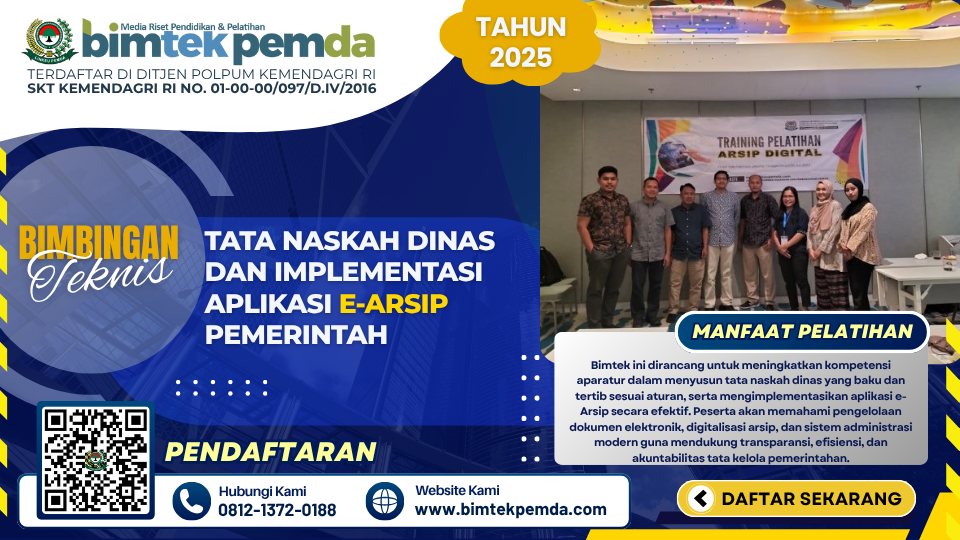 Bimtek Tata Naskah Dinas dan Implementasi Aplikasi e-Arsip Pemerintah dirancang untuk meningkatkan kompetensi aparatur dalam penataan surat-menyurat serta pengelolaan arsip elektronik yang tertib dan modern. Berdasarkan Permendagri No. 1 Tahun 2023 dan pedoman ANRI, peserta akan mempelajari teknik penulisan surat dinas, klasifikasi surat, dan digitalisasi arsip menggunakan aplikasi e-Arsip. Pelatihan ini penting untuk mendukung efisiensi administrasi, keamanan dokumen, dan reformasi birokrasi digital. Cocok bagi staf umum, arsiparis, sekretariat OPD, dan perangkat daerah yang menangani administrasi pemerintahan.